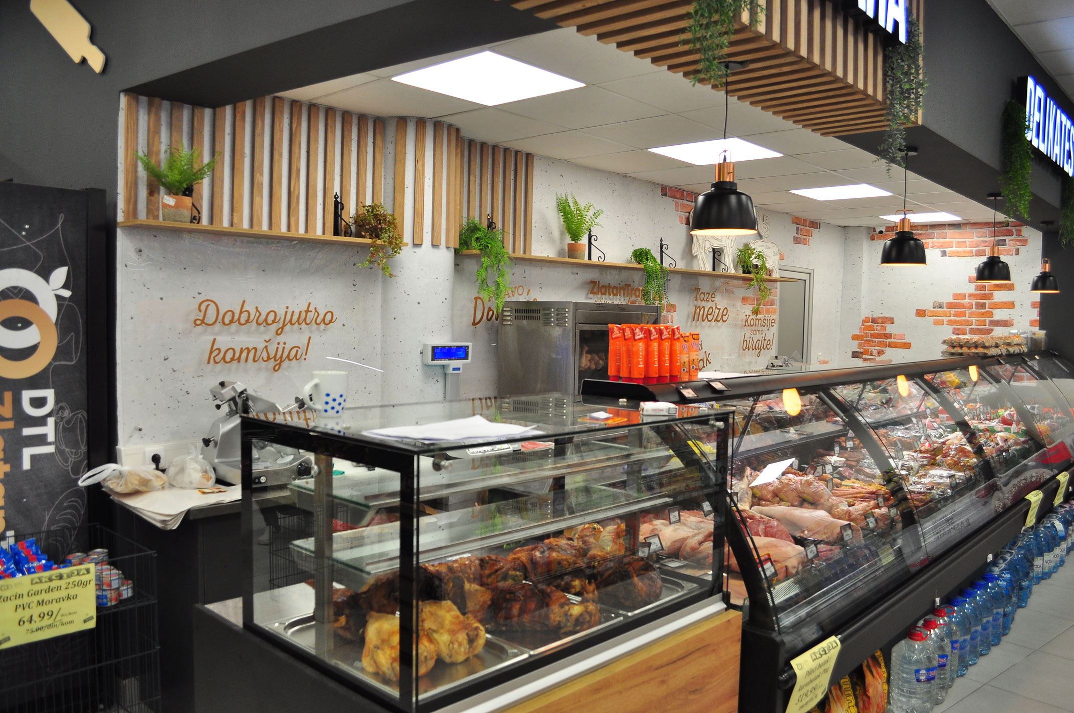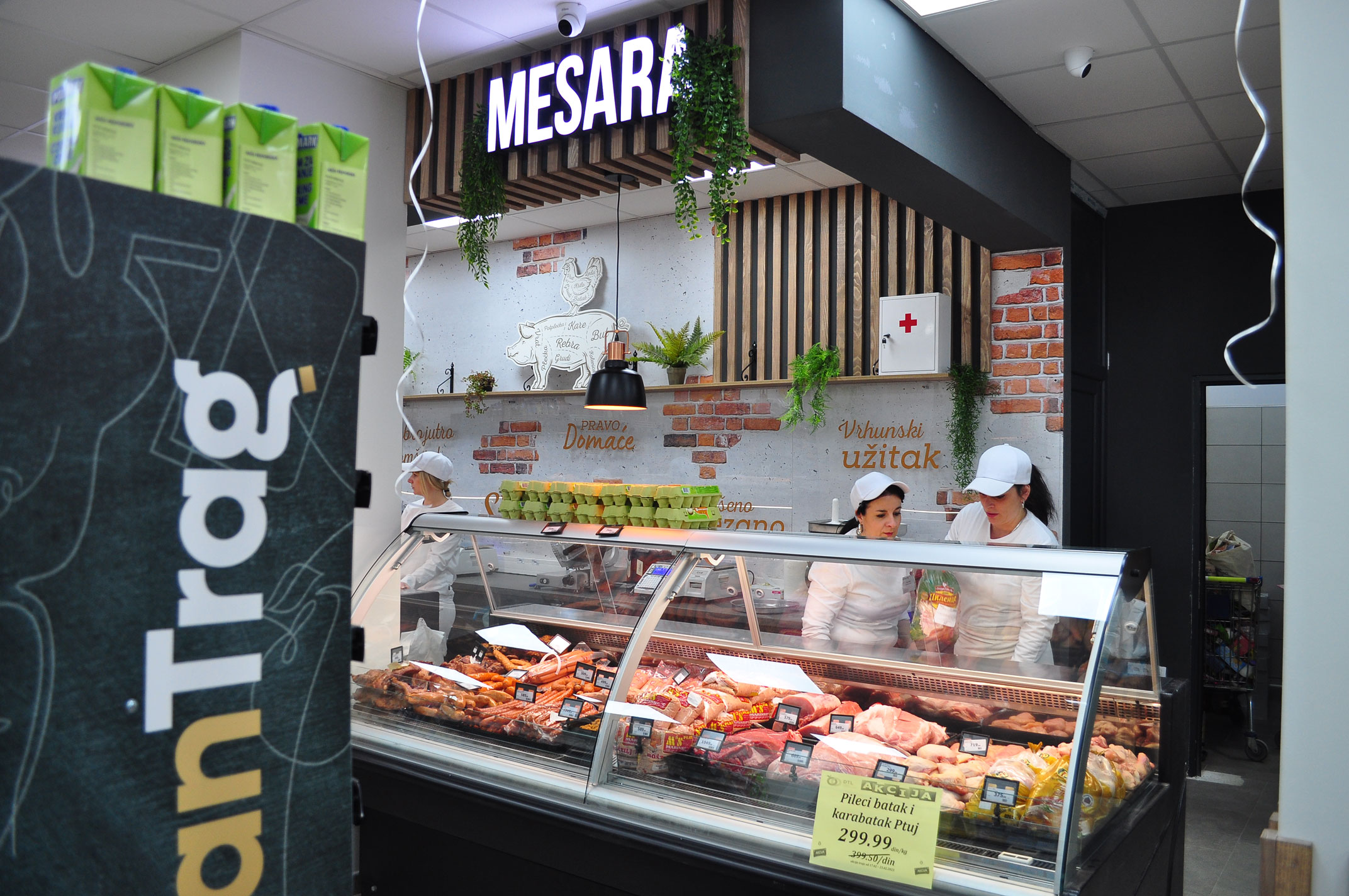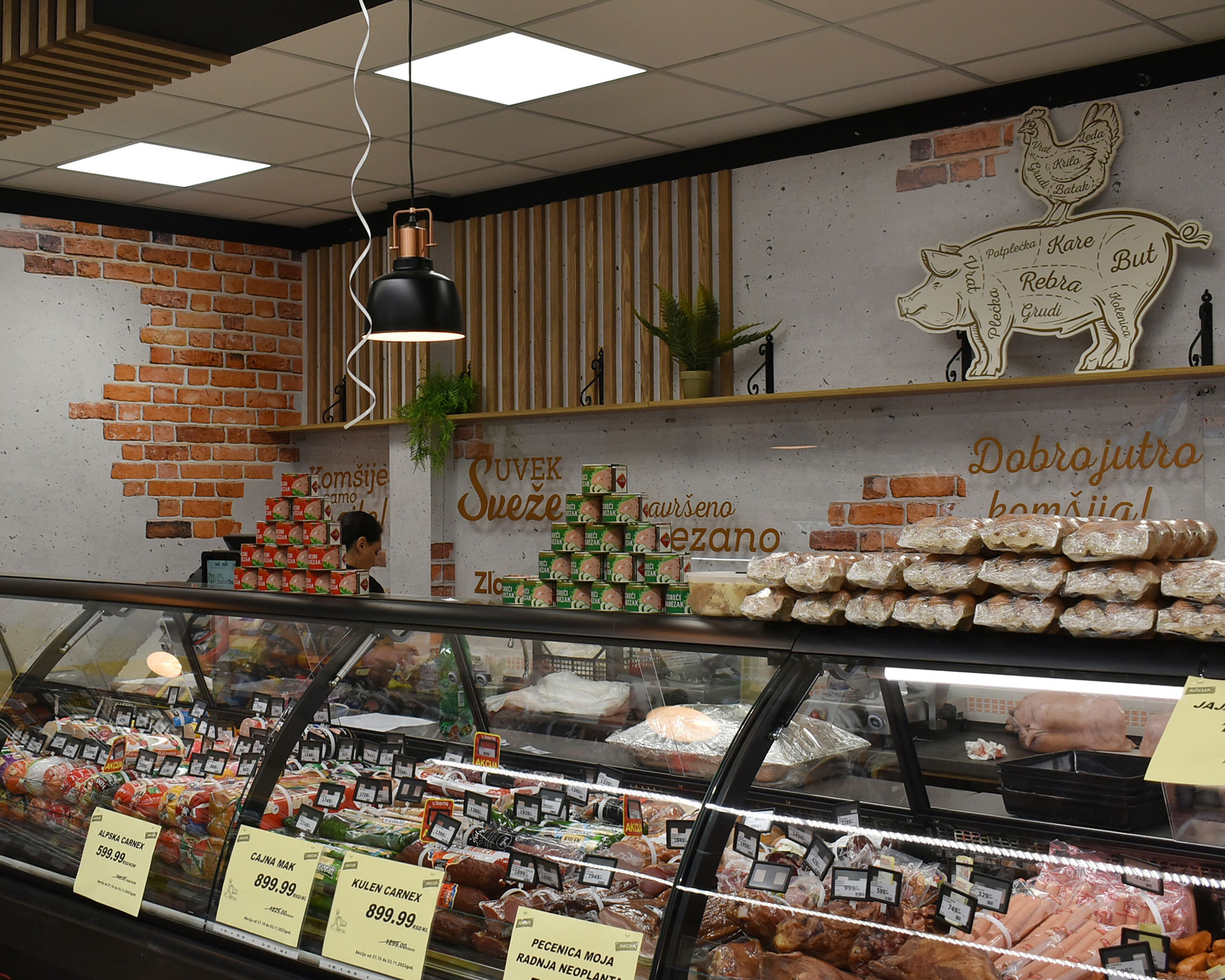 U novom i moderno opremljenom ambijentu, smešten je pažljivo odabran asortiman kvalitetnih domaćih i stranih brendova, sa atraktivnom sezonskom i ponudom sveže pečenog mesa.
