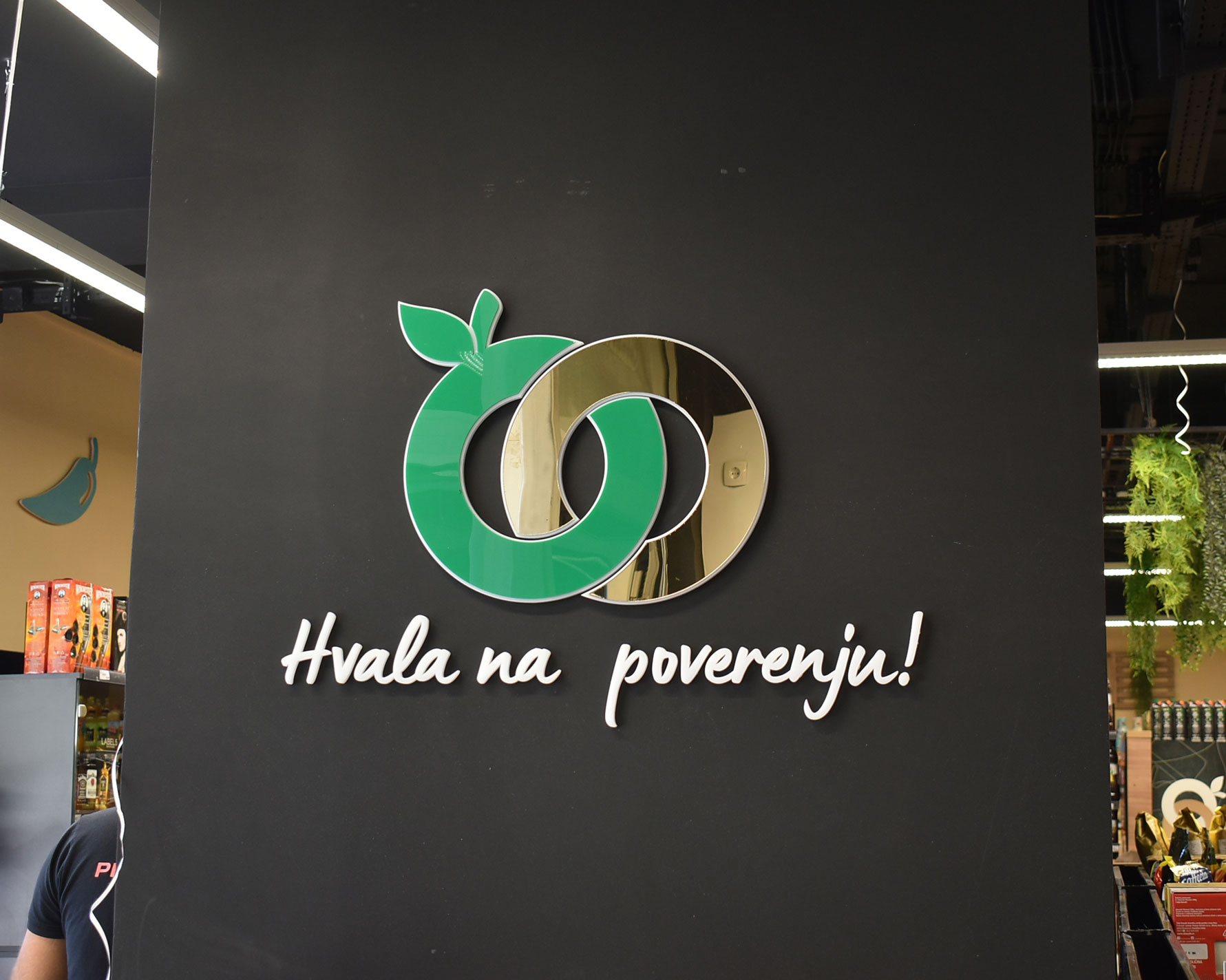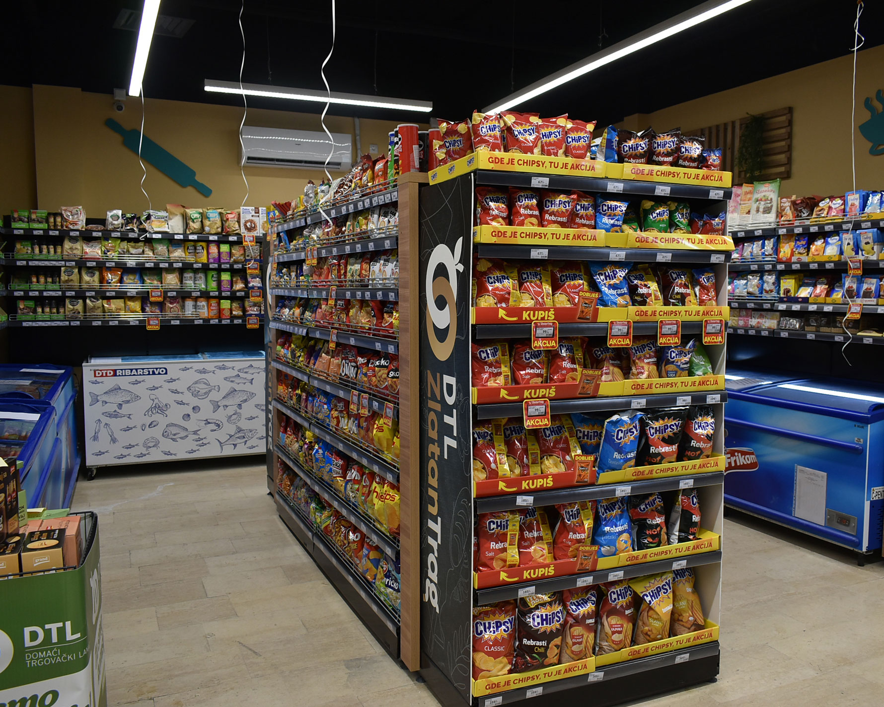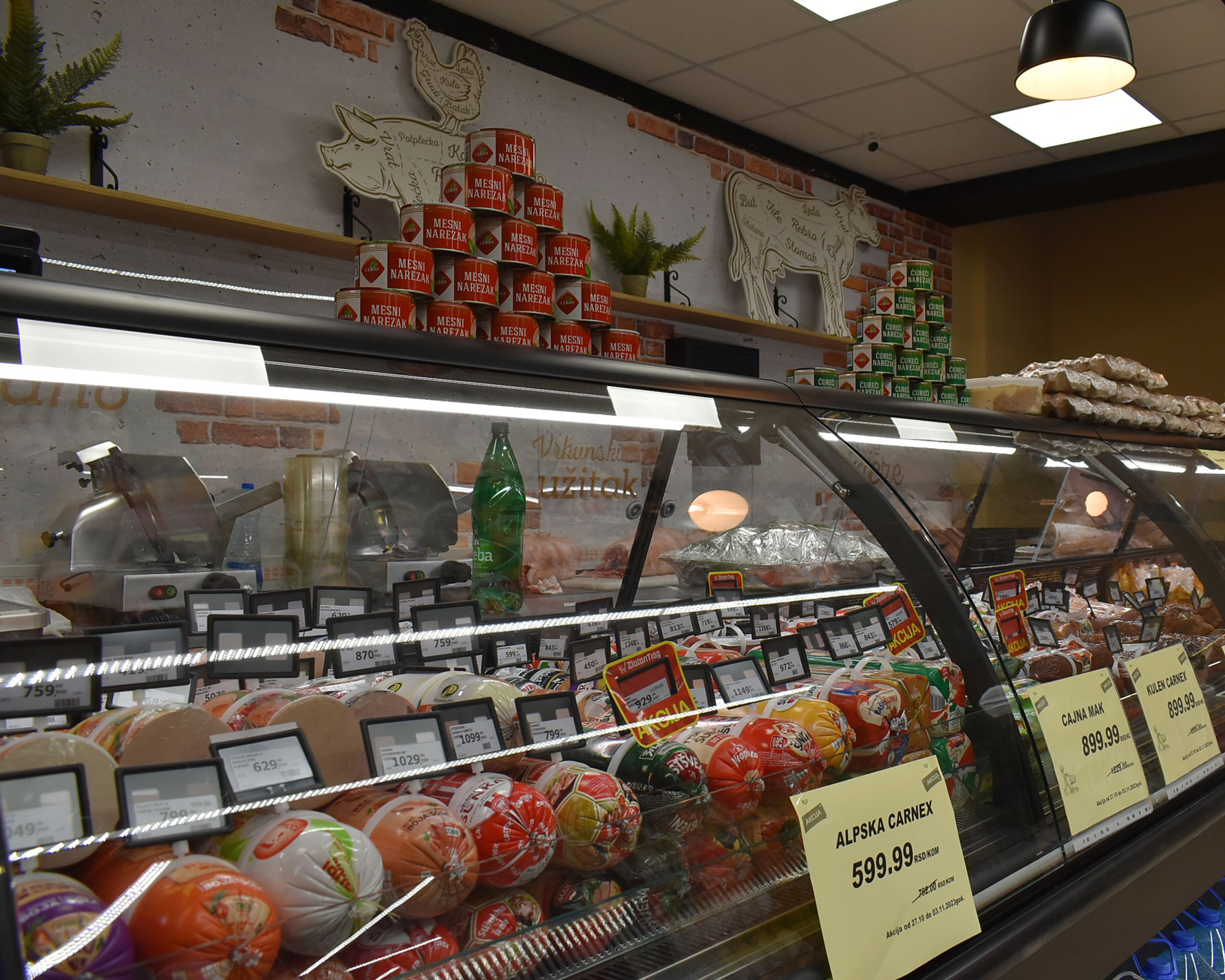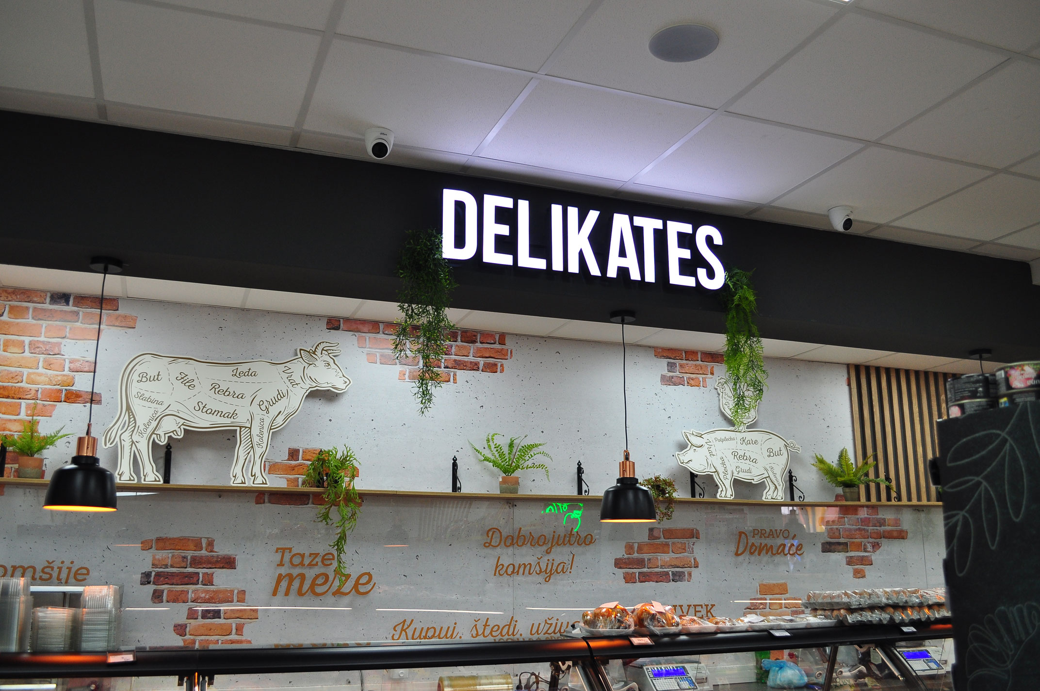 U novom i moderno opremljenom ambijentu, smešten je pažljivo odabran asortiman kvalitetnih domaćih i stranih brendova, sa atraktivnom sezonskom i ponudom sveže pečenog mesa.